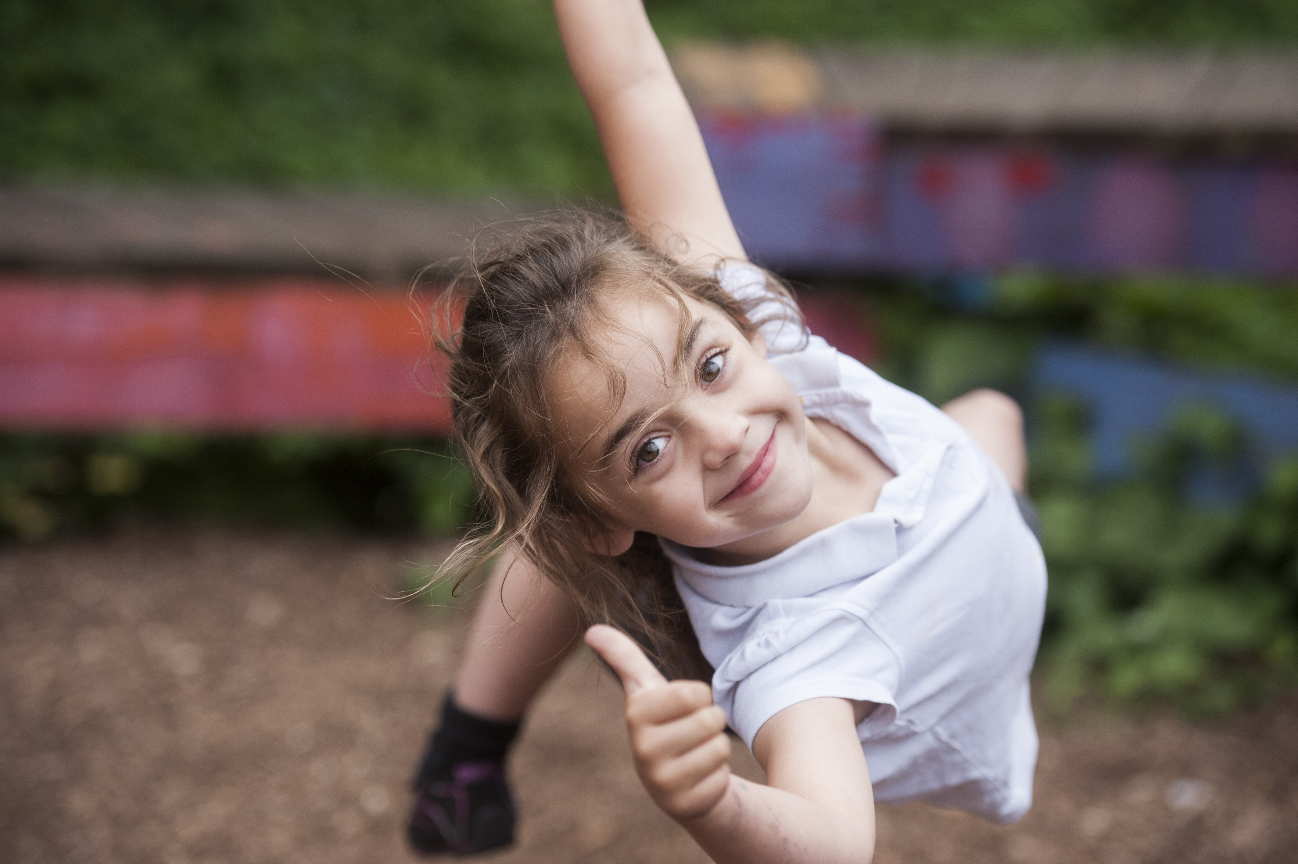 Girl swings and gives thumbs up sign in adventure playground
